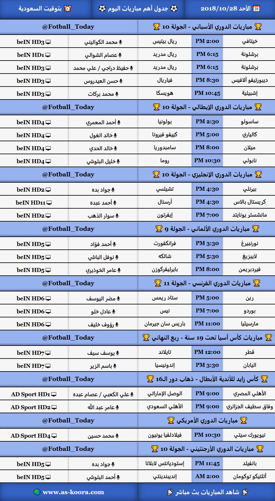 وأما في هذه الخانة فيتم عرض كافة المُباريات التي سوف تُقام اليوم في كافة البطولات العالمية والأفريقية والمحلية، كما يعرض الجدول أيضًا العديد من.